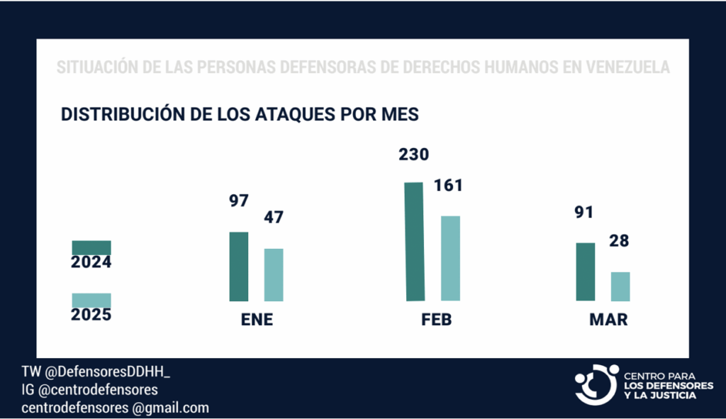 El Centro para los Defensores y la Justicia (CDJ) documentó 236 ataques e incidentes de seguridad durante el primer trimestre de 2025. La Política de Criminalización, Represión y Control social sigue siendo aplicada en contra de quienes promueven, defienden, y exigen derechos humanos en Venezuela.