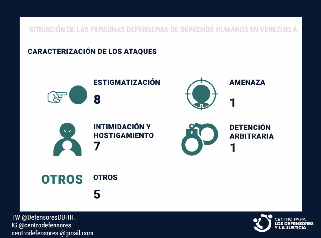 La estigmatización y los actos de intimidación y hostigamiento se presentan como los principales patrones de agresión implementados durante el mes. Las campañas de estigmatización estuvieron orientadas a desprestigiar a las organizaciones, acusándolas de “agentes desestabilizadores”, o de “corruptos” entre otros, con el fin de desacreditar sus acciones y pretender vincular la defensa de derechos humanos en Venezuela con actividades al margen de la ley.